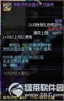 dnf11月灵跃大献礼活动介绍: 每个帐号只能领取1次灵跃大礼盒,完成3次任意任务,即可获得礼物券,登录送一张,在地下城中装备上,即可享受限时的特殊Buff加成