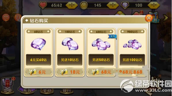 随着副本推进功能会逐一开放 游戏费用:7.0分 界面看上去比较常规,屏幕上方显示着自己的体力、金币和钻石,然后还附带了一个“+”号,于是机智的Lion就明白什么意思了,如果觉得东西不够多,按这个加号购买就是了。补充体力和兑换金币都要使用钻石,100钻石购买120体力,10钻石兑换18888金币,钻石怎么获得呢?当然得用火红的毛爷爷来买啦!售价为6元60钻,多买有优惠。这钻石最大的用处我还没说,就是召唤伙伴,这里使用280钻石即可召唤一名伙伴,大家应该都知道,抽卡什么的,土豪与欧洲人的天下。