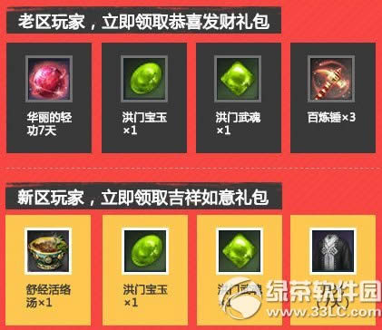 2、玩剑灵 超级好礼拿不停 老区玩家,立即领取恭喜发财礼包 华丽的轻功、洪门宝玉、洪门武魂、百炼锤 新区玩家,立即领取吉祥如意礼包 舒筋活络汤、洪门宝玉、洪门武魂、月光