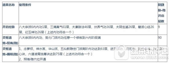 穴位开启道具使用条件与对应开启经脉层数: