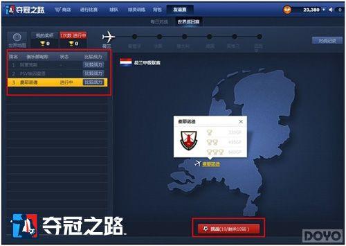玩家可以从在联赛中倒数第一的球队开始挑战,获胜之后就可以继续挑战排名靠前一位的球队。每天挑战次数为十次。以此类推,点击世界地图可返还选择联赛界面。