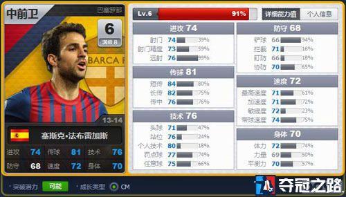 【成长类型】 表示球员在球场上可以胜任的位置。球员目前踢得红色区域为“精通”,而其他位置显示为灰色,而球星可以通过比赛场次的积累触发胜任其他的位置,只要将箭头放在灰色区域就可以查看所需比赛场次。