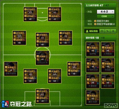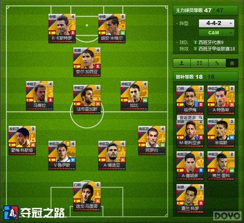 这套阵容是以西班牙联赛和西班牙国籍的球员为组队基本原则,由于18人全部由西班牙联赛的西班牙籍球员组成,直接触发了两个球队特效:西班牙代表9(首发9名西班牙球员所有能力加3)和西班牙甲级联赛18(所有球员能力值加8)目前联赛和国籍的特效加成是相对较大的,所以基本玩家都是以联赛和国籍组建自己的队伍。