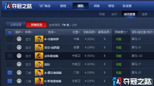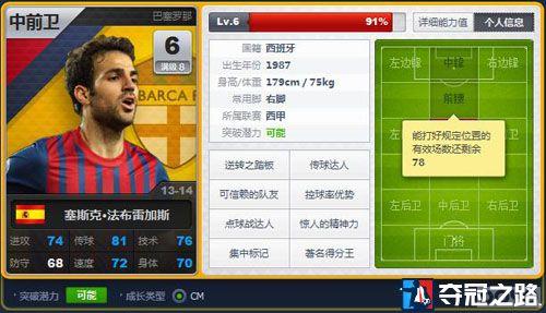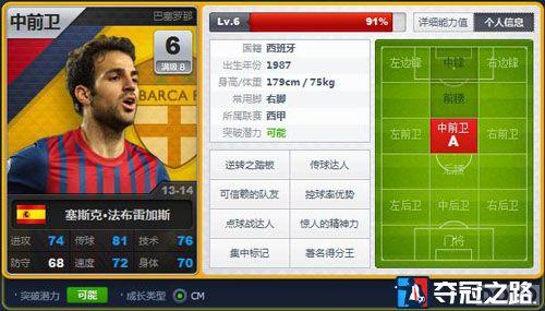 法布雷加斯无疑是这只队伍中的核心队员,作为一个全能中场,小法的指数相当平均攻守兼备。传球和技术都已经达到七八十的数值,我们会注意到在照片下方有突破潜力和成长类型这两个属性,这里说明一下: