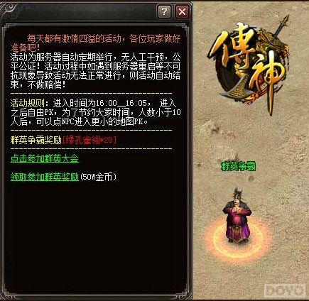 群英争霸战群英 在37《传神》公测中,每日16:00会开启群英争霸大型PK活动。16:00—16:05为进入时间,16:05之后开始PK,最后留下的玩家将是群英霸主!37《传神》群英争霸地图,PK不加PK值,为了节省PK时间,当地图内人数小于10人时,玩家可以点NPC进入更小的地图PK。