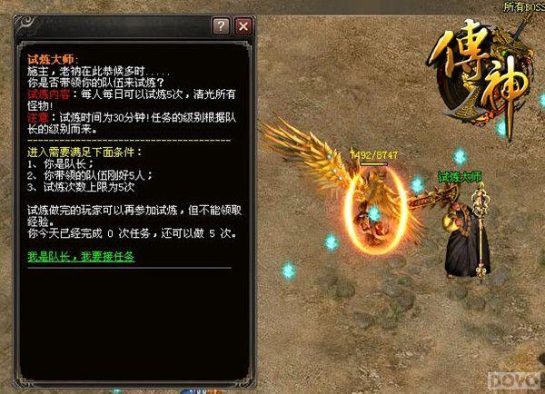试炼大师派经验 队长带队进入37《传神》试炼副本,根据队长等级的不同,进入不同难度的试炼副本,杀光副本里所有的怪之后,可以领取海量经验。根据玩家等级的不同,由可以领取不同档次的经验奖励,使用元宝可以领取多倍奖励!