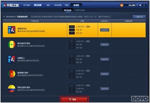 《夺冠之路》中的友谊赛分为每日对战和世界巡回赛两个部分。在每日对战部分,玩家可挑战的队伍名单将会每天自动更新或赛季结束确认时更新,每日1个队一次,最多可挑战5次。挑战的队伍不同,将会获得不同的奖励哦。此外,在选定要挑战的队伍之后,直接点击挑战就可进入比赛直播了。在世界巡回赛部分,玩家能够挑战世界各大国家的顶级联赛球队,点击已经点亮的国旗就可直接进入该国的联赛。