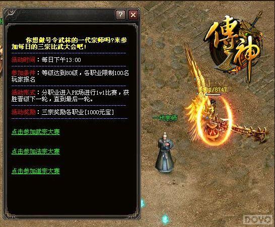 37《传神》三宗争霸系统在游戏中简称为三宗,分为武宗、法宗、道宗。为各个职业的战力最强者。三宗的评选,按照1v1单挑模式产生,活动开始后,系统自行匹配同职业玩家,进行单挑,获胜晋级下一轮,失败淘汰,最后站在地图内的玩家为三宗!将获得绿孔雀翎*10的奖励!