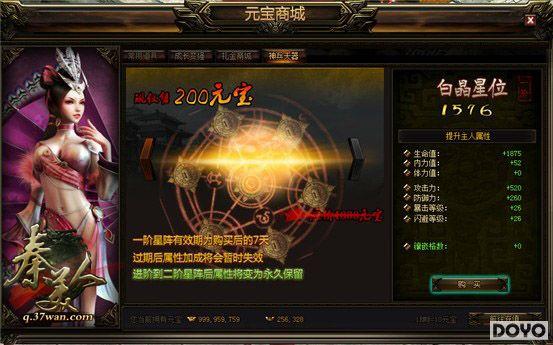 37wan《秦美人》中所有暴力的装备及道具获取途径都如出一辙,星阵也不例外,相信许多老玩家可能已经猜到了。玩家等级达到80级之后,可以在元宝商城的“神兵天器”中看到星阵的购买提示,只需要花费200元宝,就可以获得最初始的白晶星位,购买之后,星阵系统也将同步开启,星阵页面位于玩家的角色信息最后一个分页。
