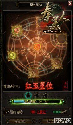 所以,对于想要永久留住星之力的玩家来说,抓紧有限的时间及时将星阵升级到二阶才是最关键的。37wan《秦美人》中升阶星阵和披风一样,拥有方便和直观的升阶进度值,当达到100%时升阶成功。 但是,星阵的升阶同时也有与披风、暗器等不同的地方,从星阵升阶的界面我们可以看到升阶进度和星星,4阶及以上星位的升阶将会分为三个阶段,正是图中星阵下所显示的三颗星星,每个升阶进度达到100%便会点亮一颗星,同时获得一部分下阶星阵的属性加成,当3个星全部点亮,则进阶成功。