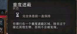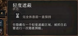 短休:在长休选项的下方,短休一次。长休同样被视为短休,即一天进行两次短休。短休可以恢复一半血量向下取整,充能部分技能,恢复邪术师的法术位。 死亡豁免检定:当一个友方角色生命值归零时,他会进入死亡检定,每回合进行一次,三次成功后会进入稳定状态,不再进行死亡检定。三次失败后会死亡,可以通过回生术复活。死亡检定状态可以通过队友的治疗效应或者协助技能来脱离,注意稳定状态仍然需要治疗或协助来脱离。 推离:使用一个额外动作将目标推开最多4m的距离,对于无戒心目标必定成功。此技能可以将敌人推下悬崖以达成一击必杀,或者将敌人推下高地获取优势,将敌人推开防止反应动作。 隐藏:使用一个额外动作进行隐藏(需要处于对方的视野盲区)。进入隐藏状态后,只要不进入敌人的视线范围便很难被发现,而隐藏状态下,地表会分为三个部分,空白区、轻度遮蔽和重度遮蔽,当你隐藏时,你的前进路径会显示目的地的分类。