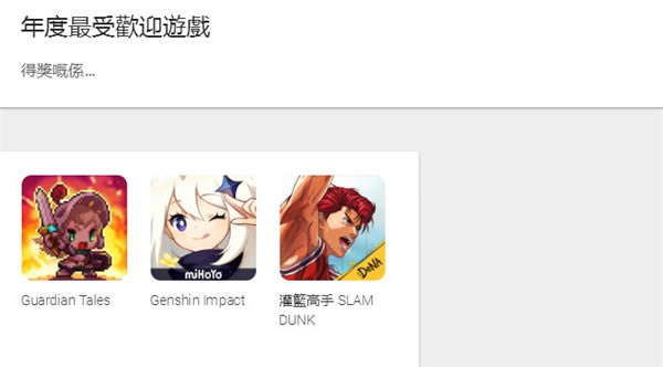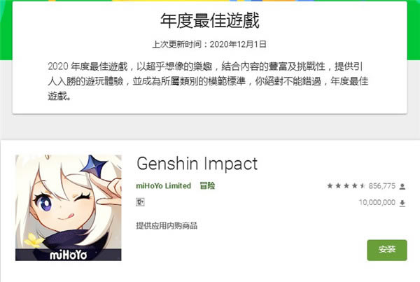 2020年Google Play年度最佳包括年度最受欢迎、年度最佳应用程式以及年度最佳游戏。《原神》成功拿下年度最佳游戏,Nüli为年度最佳应用程式。