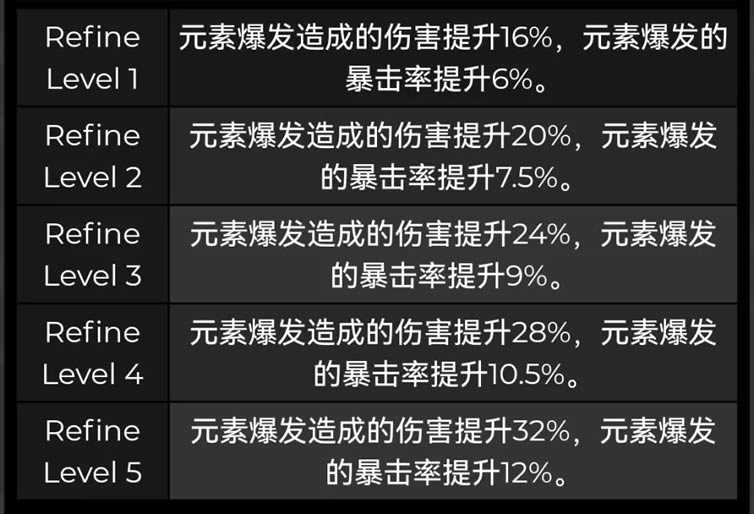 Lv90基础攻击力:510 属性加成:元素充能效率 Lv90加成数值:45.9% 武器特效(精1):元素爆发造成的伤害提升16%,元素爆发的暴击率提升6%。 渔获 精炼效果