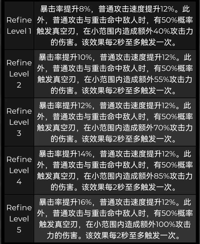 Lv90基础攻击力:674 属性加成:元素充能效率 Lv90加成数值:36.8% 武器特效(精1):暴击率提升8%,普通攻击速度提升12%。此外,普通攻击与重击命中敌人时,有50%概率触发真空刃,在小范围内造成额外40%攻击力伤害。该效果每2秒至多触发一次。 武器精炼效果 天空之脊 精炼效果