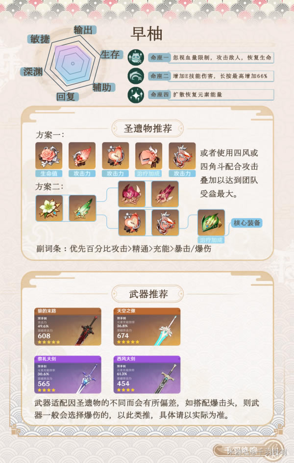为什么推荐少女圣遗物,因为千酱是将早柚作为奶妈使用的,所以在圣遗物的配比上都会按照奶那来进行思考。 而推荐大家使用攻击类武器则是基于早柚的大招进行思考的 而推荐充能类武器则是为了让早柚更快的将能量回满,让大招CD结束便释放。