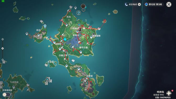 此外,天守阁东边大岛的北侧还有一个单块紫晶,没有莫娜没有神里还是别去了太远了。。不算他一共54个。