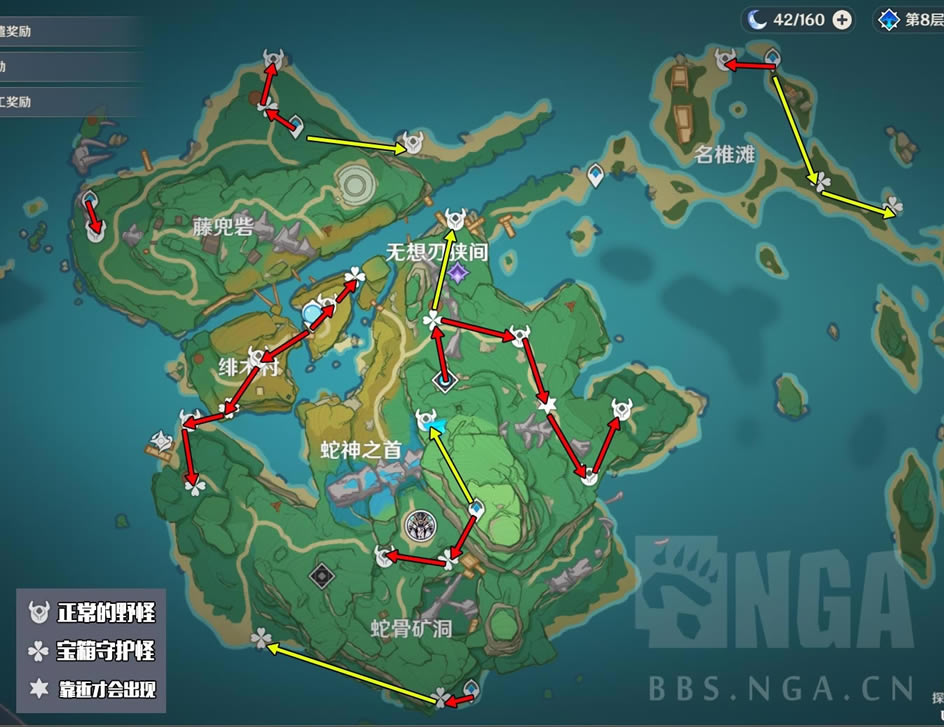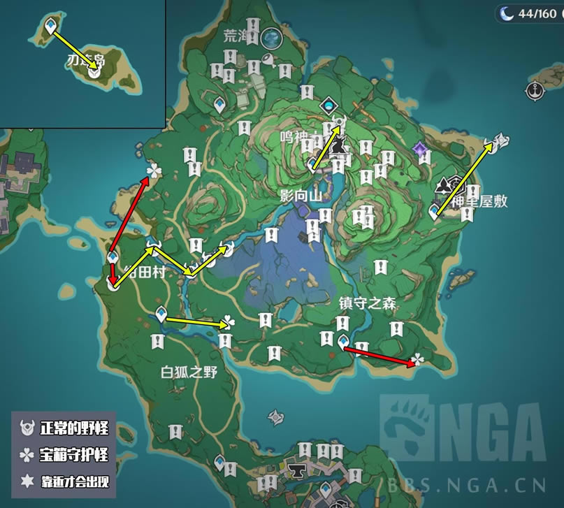 《原神》是由上海米哈游网络科技股份有限公司制作发行的一款开放世界冒险游戏,于2017年1月底立项,原初测试于2019年6月21日开启,再临测试于2020年3月19日开启,启程测试于2020年6月11日开启,PC版技术性开放测试于9月15日开启,公测于2020年9月28日开启。 原神刀镡是游戏中升级突破的关键材料,刀镡可以击杀野伏众来获取,下面给大家分享一个原神2.0稻妻地图野伏众刷怪路线 说明: 1.所有的怪物点都是我自己探索后标注的,点位会有遗漏。 2.标注的怪分三种,其中第二种宝箱守护怪,猜测有些可能打完以后不再刷新,但现在无法判断。如果在当前点位找不到怪的话去下个点就可以了。 3.脑测神里满级满天赋+雾切满级的所需刀镡可能需要锄3遍以上,这掉率就离谱 红线为比较高效率的路线,黄线为比较低效的路线。 推荐有朋友的话可以互相刷红色线路。自闭玩家全刷就完了。 ? 八酝岛 ...