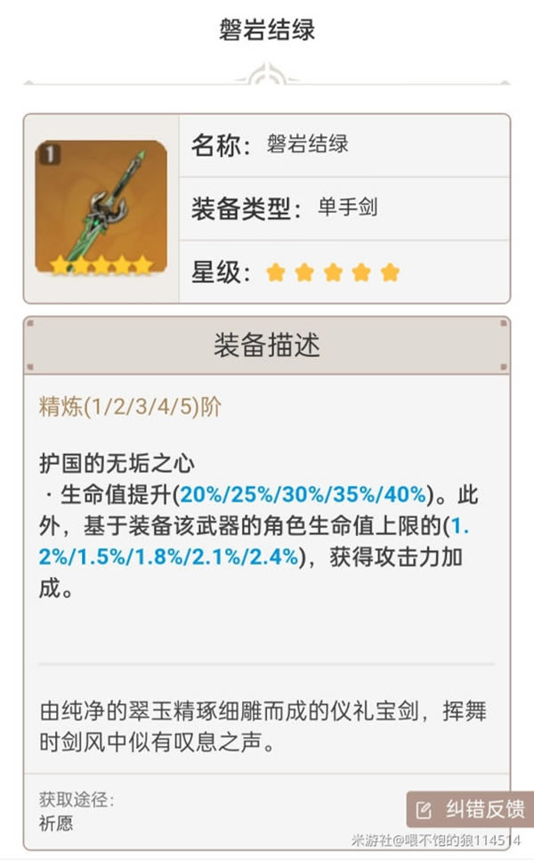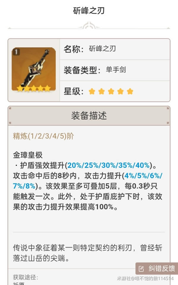 泛用性 高 适合角色 所有单手剑角色 属性 基础攻击力542 暴击率44.1% 磐岩结绿拥有五星里最低的白值,与之相称的是它那高到恐怖的暴击率。就算你圣遗物只有一点暴击率,暴击率也能有50%。事实上带绿剑的角色暴击率基本都是超过70%的,再不济也有60%左右,可以无脑堆爆伤 而且被动生命加攻击跟护摩之杖类似,但是比护摩低。如果未来有类似胡桃钟离这种的肉单手剑角色,那么和结绿的契合度是很高的 缺点就是白字过低,被动在角色两万血的情况下只提供240点攻击,没有班尼特时攻击力难叠。而且因为主属性加暴击率,所以上限较低 t0.5 斫峰之刃