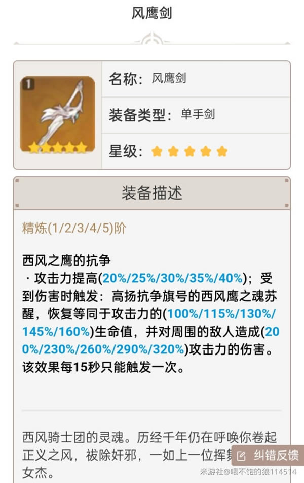 泛用性 高 适用角色 所有单手剑角色 属性 基础攻击力608 攻击力49.6% 盾剑的上限是非常高的。被动稳定的攻击力加成和副词条巨额的攻击力加成,让带了盾剑的角色攻击力暴涨,上限极高 但是属性模板套的狼末一类,所以双爆难叠,所以比较适合冰套凯亚。其他角色如果暴击率合格,那带了爆伤头的盾剑无疑是所有单手剑里上限最高的一把,可以打出可观的伤害 t1 风鹰剑 祭礼剑 腐蚀之剑 黑剑 匣里龙吟风鹰剑