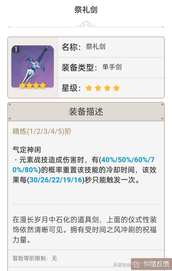 泛用性 高 适用角色 行秋 七七等等 属性 基础攻击力454,元素充能效率61.3% 祭礼地位高的原因一是因为泛用性高,因为单手剑辅助非常多,比如祭礼琴二连摔,祭礼七七刷新技能等等 二是因为水神行秋,行秋带充能沙漏和祭礼剑,充能230左右的情况下,触发被动就能两个技能充满大招。高精祭礼更是和行秋完美契合,高刷新率,短cd,让行秋的大招基本只需要等cd,极其实用 缺点:毕竟只是一把辅助武器,所以伤害不能保证。祭礼行秋的伤害是不如输出剑的行秋的,如果追求伤害可以换成绿剑黎明 腐殖之剑