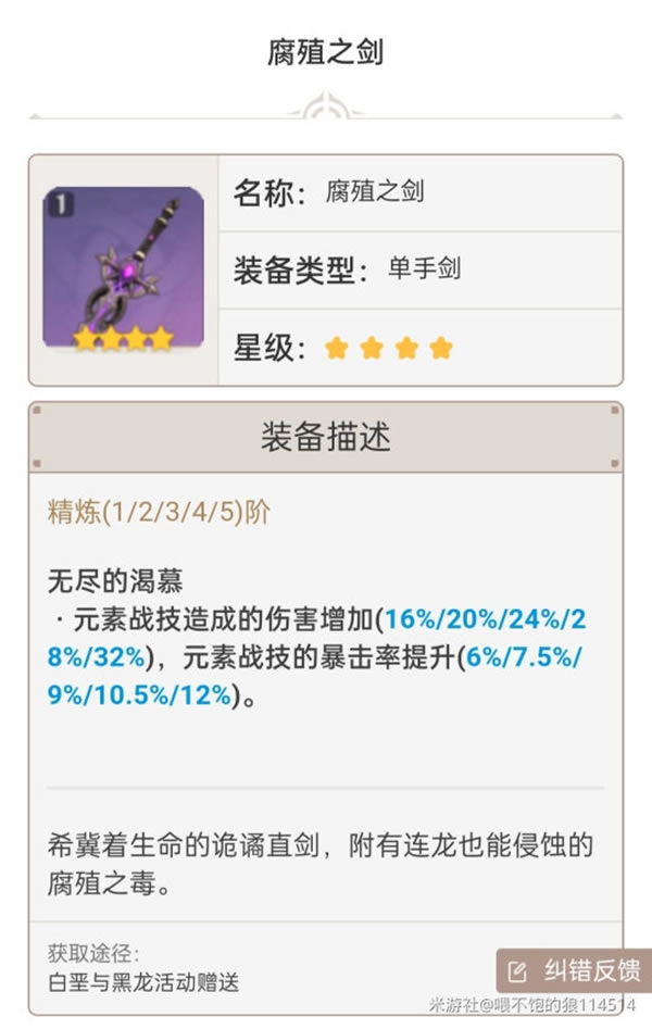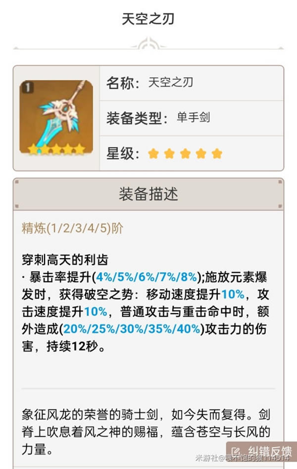 泛用度 中 适用角色 刻晴 渡火行秋 属性 基础攻击力510 攻击力41.3% 龙吟的强度是在线的,跟盾剑相似,伤害上限很高。刻晴的四星毕业武器之一,如果双爆合格,龙吟的伤害是极其恐怖的,是四星单手剑里伤害上限最高的。但是缺点也是双爆难叠,比较难堆到一个理想的面板。而且被动触发条件比较苛刻,渡火行秋拿来打爆发倒是不错,除了刻晴,被动没那么容易触发 t1.5 天空之刃 黑岩斩刀 西风剑天空之刃