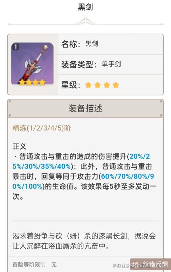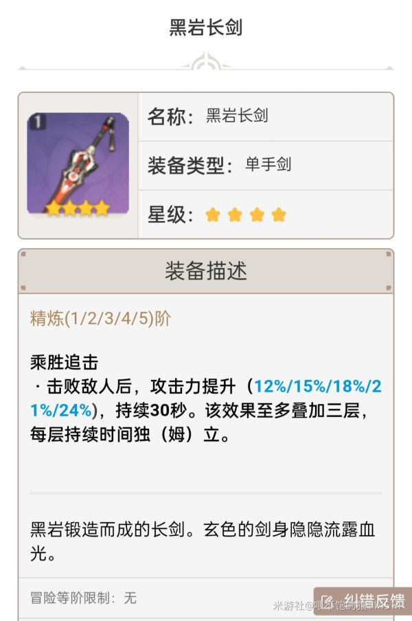 泛用性 高 适用角色 除了单手剑辅助外的单手剑角色 属性 基础攻击力565 暴击伤害36.8% 黑岩老生常谈了,自身强度尚可。可以补面板,但是对单白板,是一把对群特化的武器。适用场景在小怪多的层数,或者是大世界。3层被动的黑岩伤害还是很高的。建议没有武器用的换一把黑岩用用 西风剑