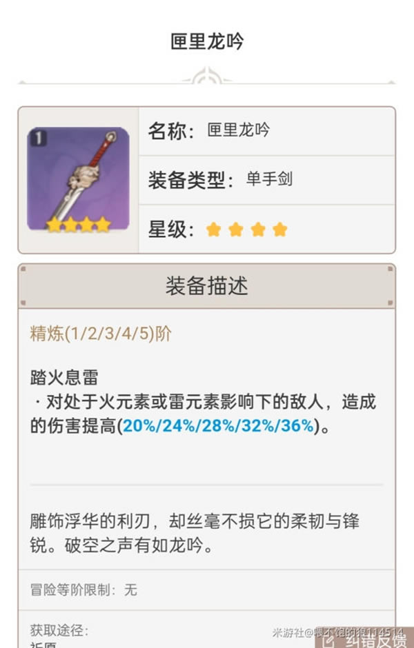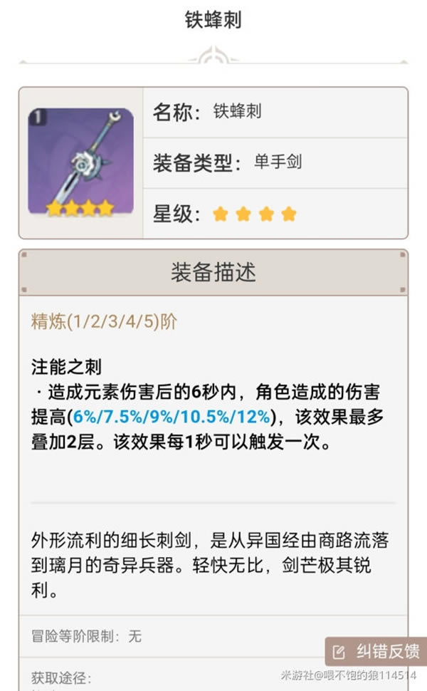 泛用性 低 适用角色 琴 风主(?) 属性 基础攻击力510 元素精通165 铁蜂刺目前适用的场景有限,大部分人物都不会携带铁蜂刺。万叶出来以后,估计会成为辅助万叶的四星专武 本次分享游戏《原神》攻略。 |