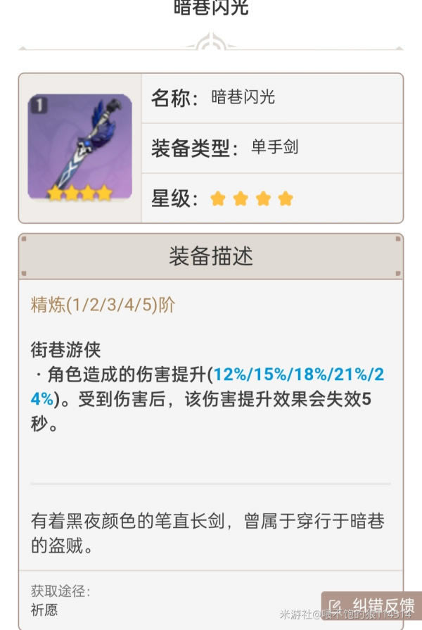 泛用性 低 适合角色 班尼特 属性 基础攻击力620 元素精通55 暗巷的特色是它的超高白字,缺点也是它的超高白字。因为白字占模,导致副词条低的可怜,而且因为副词条是元素精通的原因,适用范围有限。现在主要的用途是给班尼特使用,暗巷的高白字可以提高班尼特的基础攻击力,让班尼特可以加更多攻击。 笛剑