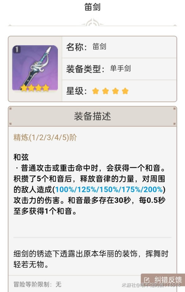 泛用性 中 适合角色 琴 属性 基础攻击力510 攻击力41.3% 笛剑是典型的主c武器,被动可以稳定提供额外200%的倍率,这个伤害吃双爆攻击,可以视为普攻伤害,很适合主c琴使用,但是被动的泛用性实在太低。这把剑跟古华是很像的,都是攻击力副词条,没武器可以用用,一旦拥有上位替代,就只能睡仓库。笛剑拥有很多的上位武器,大部分情况下玩家一般都不会使用笛剑 试作斩岩