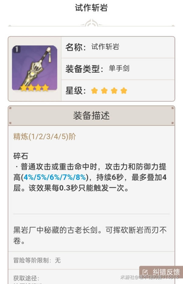 泛用性 低 适用角色 物理流角色 属性 基础攻击力565 物理伤害加成34.5% 斩岩的设计思路就是一把主c武器,被动提供的攻击力可以有效提升主c的伤害,防御力可以提升角色的生存能力。但是副词条的物理伤害加成使得武器的泛用性低了不少,目前只适合物理流主c,比如物理刻晴,物理凯亚等等。 宗室长剑
