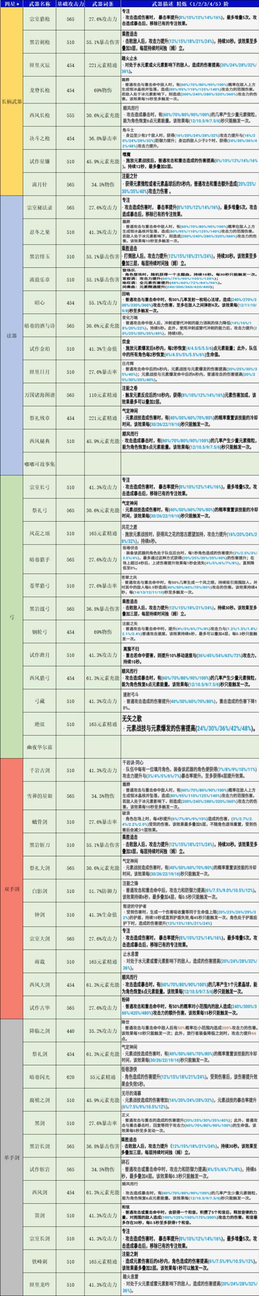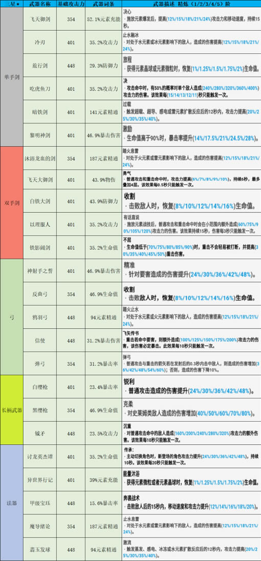 五星? 武器名称 基础攻击力 武器词条 武器描述 精炼(1/2/3/4/5)阶 长柄武器 和噗鸢 674 22.1%暴击率 护摩之杖 608 66.2%暴击伤害 天空之脊 674 36.8%元素充能 贯虹之槊 608 49.6%攻击力 法器 四风原典 608 33.1%暴击率 天空之卷 674 33.1%攻击力 尘世之锁 608 49.6%攻击力 弓 天空之翼 674 22.1%暴击率 阿莫斯之弓 608 49.6%攻击力 终末嗟叹之诗 608 55.1%元素充能 双手剑 狼的末路 608 49.6%攻击力 无工之剑 608 49.6%攻击力 天空之傲 674 36.8%元素充能 松籁响起之时 741 20.7% 物伤 单手剑 磐岩结绿 542 44.1%暴击率 风鹰剑 674 41.3%物伤 天空之刃 608 55.1%元素充能 斫峰之刃 608 49.6%攻击力 苍古自由之誓 暂无 四星? 武器名称 基础攻击力 武器词条 武器描述 精炼(1/2/3/4/5)阶 长柄武器 宗室猎枪 565 27.6%攻击力 黑岩刺枪 510 55.1%暴击伤害 匣里灭辰 454 221元素精通 龙脊长枪 454 69%物伤 西风长枪 555 30.6%元素充能 决斗之枪 454 36.8%暴击率 试作星镰 510 45.9%元素充能 流月针 565 34.5%物伤 法器 宗室秘法录 565 27.6%攻击力 忍冬之果 510 41.3%攻击力 黑岩绯玉 510 55.1%暴击伤害 流浪乐章 510 55.1%暴击伤害 昭心 454 55.1%攻击力 暗巷的酒与诗 565 30.6%元素充能 试作金珀 510 41.3%生命值 匣里日月 510 27.6%暴击率 万国诸海图谱 565 110元素精通 祭礼残章 454 221元素精通 西风秘典 510 45.9%元素充能 嘟嘟可故事集 暂无 弓 宗室长弓 510 41.3%攻击力 祭礼弓 565 30.6%元素充能 风花之颂 510 165元素精通 暗巷猎手 565 27.6%攻击力 苍翠猎弓 510 27.6%暴击率 黑岩战弓 565 36.8%暴击伤害 钢轮弓 454 69%物伤 试作澹月 510 41.3%攻击力 西风猎弓 454 61.3%元素充能 弓藏 510 41.3%攻击力 绝弦 510 165元素精通 幽夜华尔兹 暂无 双手剑 千岩古剑 510 41.3%攻击力 雪葬的星银 565 34.5%物伤 螭骨剑 510 27.6%暴击率 黑岩斩刀 510 55.1%暴击伤害 祭礼大剑 565 30.6%元素充能 白影剑 510 51.7%防御力 钟剑 510 41.3%生命值 宗室大剑 565 27.6%攻击力 雨裁 510 165元素精通 西风大剑 454 61.3%元素充能 试作古华 565 27.6%攻击力 单手剑 降临之剑 440 35.2%攻击力 祭礼剑 454 61.3%元素充能 暗巷闪光 620 55元素精通 腐殖之剑 510 45.9%元素充能 黑剑 510 27.6%暴击率 黑岩长剑 565 36.8%暴击伤害 试作斩岩 565 34.5%物伤 西风剑 454 61.3%元素充能 笛剑 510 41.3%攻击力 宗室长剑 510 41.3%攻击力 铁峰刺 510 165元素精通 匣里龙吟 510 41.3%攻击力 三星? 武器名称 基础攻击力 武器词条 武器描述 精炼(1/2/3/4/5)阶 单手剑 飞天御剑 354 52.1%元素充能 冷刃 401 35.2%攻击力 旅行剑 448 29.3%防御力 吃虎鱼刀 401 35.2%攻击力 暗铁剑 401 141元素精通 黎明神剑 401 46.9%暴击伤害 双手剑 沐浴龙血的剑 354 187元素精通 飞天大御剑 401 43.9%物伤 白铁大剑 401 43.9%防御力 以理服人 401 35.2%攻击力 铁影阔剑 401 35.2%生命值 弓 神射手之誓 401 46.9%暴击伤害 反曲弓 354 46.9%生命值 鸦羽弓 448 94元素精通 信使 448 31.2%暴击伤害 弹弓 354 31.2%暴击率 长柄武器 白缨枪 401 23.4%暴击率 黑缨枪 354 46.9%生命值 钺矛 448 23.5%攻击力 法器 讨龙英杰谭 401 35.2%生命值 异世界行记 401 39%元素充能 甲级宝珏 448 15.6%暴击率 魔导绪论 354 187元素精通 翡玉发球 448 94元素精通 两星? 武器名称 基础攻击力 武器词条 武器描述 精炼(1/2/3/4/5)阶 单手剑 银剑 243 无 无 双手剑 佣兵重剑 243 无 无 弓 历练的猎弓 243 无 无 长柄武器 铁尖枪 243 无 无 法器 口袋魔导书 243 无 无 一星? 武器名称 基础攻击力 武器词条 武器描述 精炼(1/2/3/4/5)阶 单手剑 无锋剑 185 无 无 双手剑 训练大剑 185 无 无 弓 猎弓 185 无 无 长柄武器 新手长枪 185 无 无 法器 学徒笔记 185 无 无 本次分享游戏《原神》攻略。 |