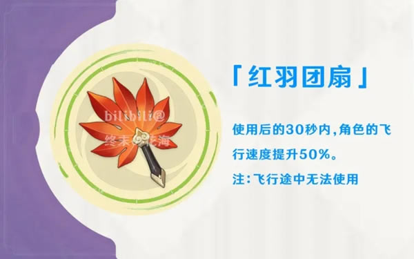 红羽团扇 效果:使用后的30秒内,飞行速度增加50%。(飞行过程中不可使用) 4.迷你仙灵·紫苑