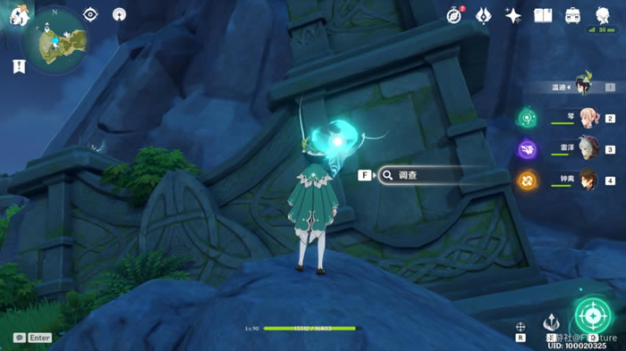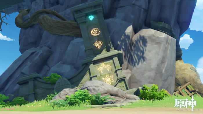 ▲停在山下的仙灵 在周围调查 虽然放眼望去,周围确实有很多各式各样的机关,但这次调查我们并不用走远,调查点就在仙灵旁边这个刻着元素符号的石柱上,靠近即可调查。