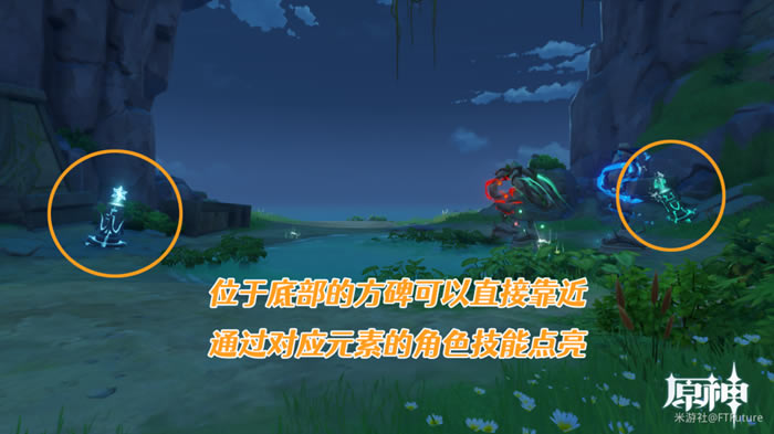 ▲四个元素方碑的位置 根据已知的提示,我们要做的应该就是按照石柱上元素符号亮起的顺序,依次点亮这4个元素方碑了。 再次强调一定要按照下面顺序依次点亮,否则还要重新操作。 ▌方碑一 第一个需要点亮的是冰元素方碑,这个方碑就在地面上,使用具有冰元素技能的角色点亮方碑即可,例如四星角色凯亚。 ▌方碑二 第二个需要点亮的是风元素方碑,这个方碑同样也在地面上,使用具有风元素技能的角色点亮方碑即可,例如风主。