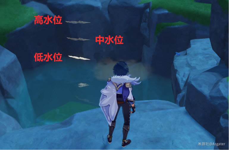 (5处山峰水潭水位总览) 1号岛为中水位、2号岛为高水位、3号岛为低水位、4号岛为中水位、5号岛为低水位。