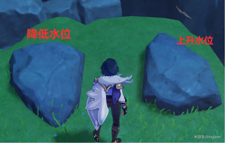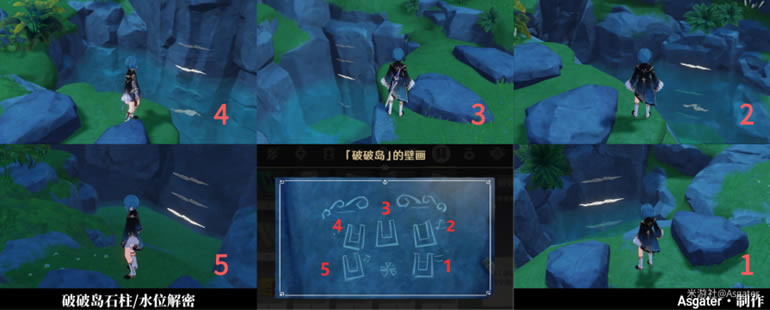 (破破岛壁画·展示图) 5、将壁画内的5个水池同破破岛所存在的5处水池标记,并依次对应; 6、找到所标记的水池,然后根据壁画上所展示的水位来进行调节: 水位分为3类:低水位、中水位、高水位;