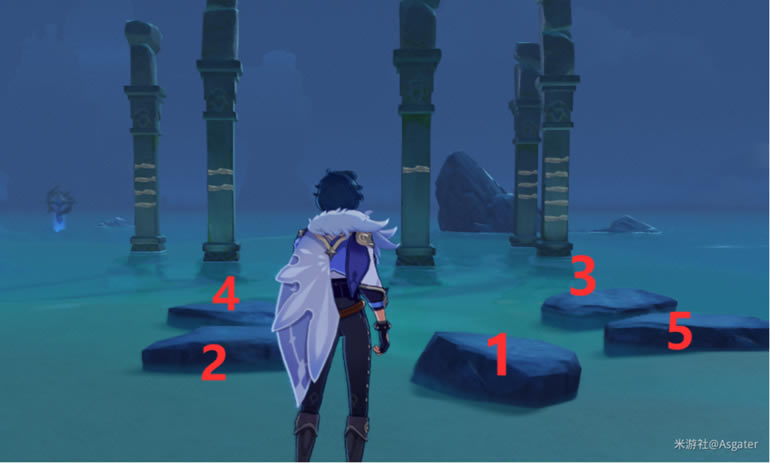 (石柱标记处) 8、根据石柱所在刻度所表示的数,依次踩踏石柱前的5块响石(如下图序号所示),并使其发出声音即可完成该处解密!