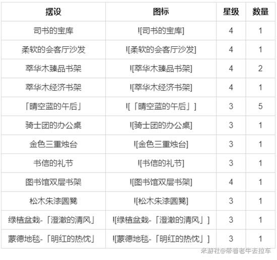 《原神》是由上海米哈游网络科技股份有限公司制作发行的一款开放世界冒险游戏,于2017年1月底立项,原初测试于2019年6月21日开启,再临测试于2020年3月19日开启,启程测试于2020年6月11日开启,PC版技术性开放测试于9月15日开启,公测于2020年9月28日开启。 原神1.6中室内赠礼套装是很多玩家关注的重点,本次就为大家带来了原神1.6室内赠礼套装大全,也是获取、角色及摆设汇总,非常全面的内容,想了解1.6室内赠礼套装的朋友可以参考,希望能帮到大家。 诗歌沉思间获取方式 尘歌壶-阿圆-洞天百宝-摆设图纸 好感角色 - 琴 - 丽莎 - 菲谢尔 - 莫娜 - 优菈 所需摆设 - 司书的宝库(4):1 - 柔软的会客厅沙发(4):1 - 萃华木臻品书架(4):2 - 萃华木经济书架(4):1 - 「晴空蓝的午后」(3):5 - 骑士团的办公桌(3):1 - 金色三重烛台(3):1 - 书信的礼节(3):1 - 图书馆双层书架(4):1 - 松木朱漆圆凳(3):1 - 绿植盆栽-「澄澈的清风」(3):1 - 蒙德地毯-「明红的热忱」(3):1