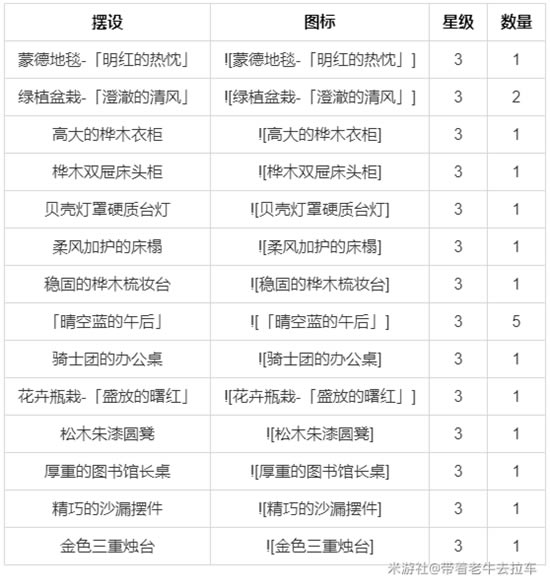 柔风低语间获取方式 尘歌壶-阿圆-洞天百宝-摆设图纸 好感角色 - 芭芭拉 - 优菈 - 诺艾尔 所需摆设 - 蒙德地毯-「明红的热忱」(3):1 - 绿植盆栽-「澄澈的清风」(3):2 - 高大的桦木衣柜(3):1 - 桦木双屉床头柜(3):1 - 贝壳灯罩硬质台灯(3):1 - 柔风加护的床榻(3):1 - 稳固的桦木梳妆台(3):1 - 「晴空蓝的午后」(3):5 - 骑士团的办公桌(3):1 - 花卉瓶栽-「盛放的曙红」(3):1 - 松木朱漆圆凳(3):1 - 厚重的图书馆长桌(3):1 - 精巧的沙漏摆件(3):1 - 金色三重烛台(3):1
