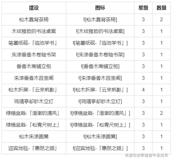 飞云文斋获取方式 尘歌壶-阿圆-洞天百宝-摆设图纸 好感角色 - 行秋 - 钟离 - 凝光 所需摆设 - 松木靠背茶椅(3):2 - 木纹雅致的书法桌案(3):1 - 笔墨纸砚-「临池学书」(3):1 - 朱漆垂香木卷轴书架(3):1 - 垂香木商铺立柜(3):1 - 朱漆垂香木百宝阁(3):1 - 松木折屏-「云来帆影」(4):1 - 琉璃亭却砂木立灯(3):1 - 绿植盆栽-「澄澈的清风」(3):2 - 绿植盆栽-「松青尺树上」(3):1 - 松木朱漆圆凳(3):1 - 迎宾地毯-「惠然之顾」(3):1