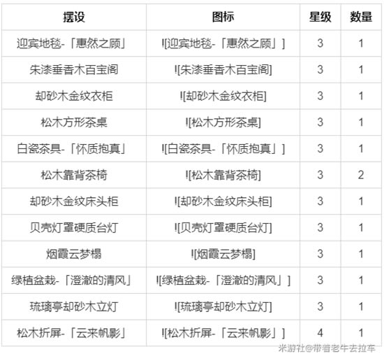烟霞入梦阁获取方式 尘歌壶-阿圆-洞天百宝-摆设图纸 好感角色 - 胡桃 - 烟绯 - 甘雨 - 刻晴 - 重云 所需摆设 - 迎宾地毯-「惠然之顾」(3):1 - 朱漆垂香木百宝阁(3):1 - 却砂木金纹衣柜(3):1 - 松木方形茶桌(3):1 - 白瓷茶具-「怀质抱真」(3):1 - 松木靠背茶椅(3):2 - 却砂木金纹床头柜(3):1 - 贝壳灯罩硬质台灯(3):1 - 烟霞云梦榻(3):1 - 绿植盆栽-「澄澈的清风」(3):1 - 琉璃亭却砂木立灯(3):1 - 松木折屏-「云来帆影」(4):1