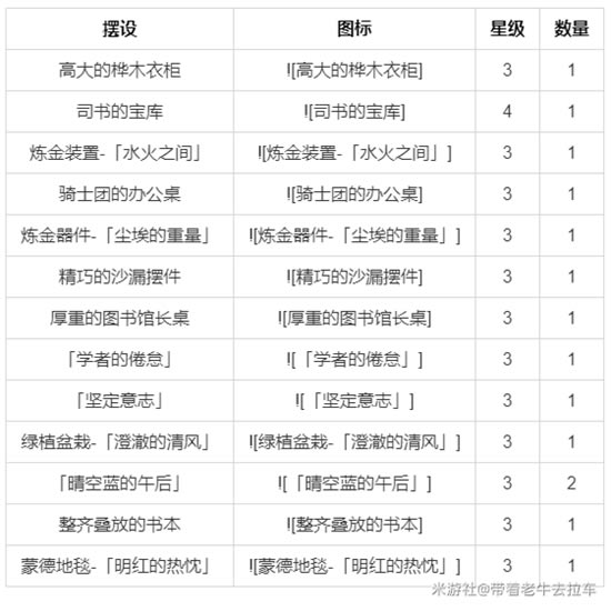 秘术研究所获取方式 尘歌壶-阿圆-洞天百宝-摆设图纸 好感角色 - 可莉 - 砂糖 - 阿贝多 - 丽莎 所需摆设 - 高大的桦木衣柜(3):1 - 司书的宝库(4):1 - 炼金装置-「水火之间」(3):1 - 骑士团的办公桌(3):1 - 炼金器件-「尘埃的重量」(3):1 - 精巧的沙漏摆件(3):1 - 厚重的图书馆长桌(3):1 - 「学者的倦怠」(3):1 - 「坚定意志」(3):1 - 绿植盆栽-「澄澈的清风」(3):1 - 「晴空蓝的午后」(3):2 - 整齐叠放的书本(3):1 - 蒙德地毯-「明红的热忱」(3):1