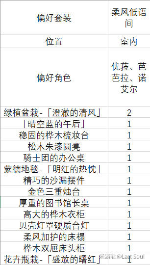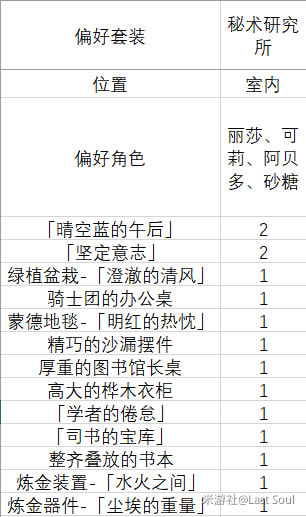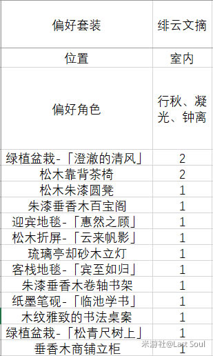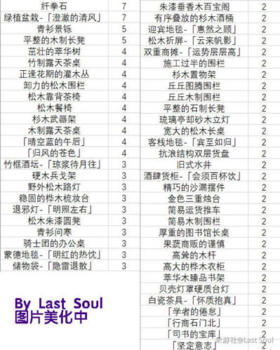 由于统计花时间较多,今天时间较晚,我暂时以我的统计表格截图放出,后续会继续制作与之前统计帖相同的图片方便大家对照。 图中未提及的均为单需求套装配件,只要购买并制作了所有可制作图纸即可。 此外有套件属于上期纪行限定套件,目前暂时不知有无新的获取方法。 室内套装