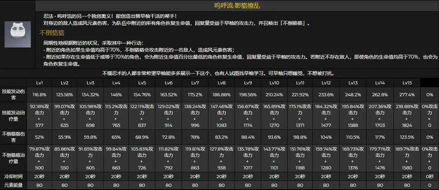 早柚开启大招需要80点能量,相比其他奶妈而言,少了充能的命座和天赋,技能树都点到输出上了。 而她的大招有点像班尼特,生命值低于70%可以恢复生命,不同的是早柚大招生命高于70%时,会攻击附近的一名敌人,造成风元素伤害。 班尼特则是获得攻击力加成,让我选的话,肯定是想要个班尼特替代品,毕竟可以辅助主C猴伤害,而不是像早柚大招那种输出型领域,还要去刷圣遗物才能搞出伤害,没有那么多体力了呀。