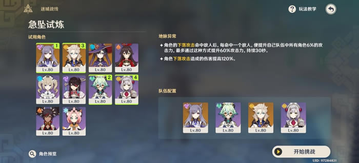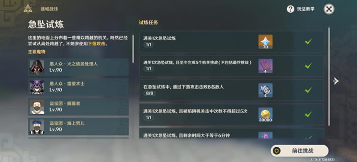 《原神》是由上海米哈游网络科技股份有限公司制作发行的一款开放世界冒险游戏,于2017年1月底立项,原初测试于2019年6月21日开启,再临测试于2020年3月19日开启,启程测试于2020年6月11日开启,PC版技术性开放测试于9月15日开启,公测于2020年9月28日开启。 原神迷城战线是很多玩家关注的游戏,本次就为大家带来了原神迷城战线攻略合集,也是全试炼打法教学,非常全面的内容,想了解原神迷城战线攻略的朋友可以参考,希望能帮到大家。 急坠试炼第一个是需要用到下落攻击击败八名敌人 ,建议用阿贝多提起高度再下落攻击或者刻晴往天空中释放E技能再下落攻击,第二个是被陷阱机关攻击中不超过五次,这边可以选择用猫猫或者女仆开启护盾抵挡住,也可以直接攻击瘫痪陷阱机关 并且这个关卡,下落攻击伤害有提升且下落攻击命中敌人的话,会有伤害提升,这点可以好好的利用一下