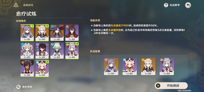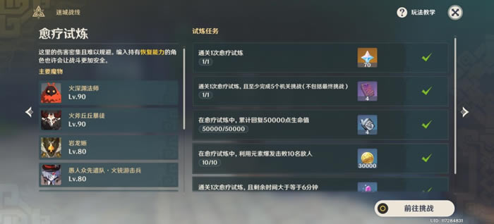 愈疗试炼一个是累计回复50000点生命值,可以使用芭芭拉、猫猫、女仆进行回血,利用喷火机关使角色血量降低,再进行回复,然后是用元素爆发击败10名敌人,这点的话,很多角色都可以做到,刻晴、阿贝多、安柏、砂糖都可以 而且这个关卡血量高于90%的时候会有伤害加成,可以注意一下血量吃到加成,生命回复时也会有元素充能