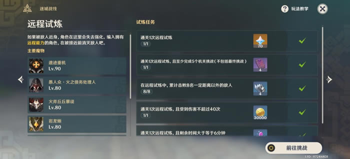 远程试炼一个是在一定距离外远程击败8名敌人,这点可以用安柏、猫猫完成,如果不习惯用弓箭角色的话,可以先用别的角色把怪物打至残血,再切换弓箭角色进行击败,然后是关卡中受伤次数不能超过40次,这一点的话,可以用女仆的护盾,或者是猫猫的护盾进行抵挡伤害 并且这个关卡身边没有敌人的时候会有攻击和移速的加成,这个效果在触发的时候角色的身上会有一个标志,注意观察一下以免没有吃到加成