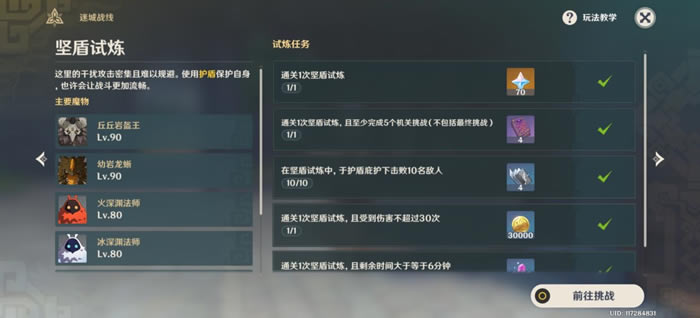 坚盾试炼一个是在护盾的庇护下击败十名敌人,这一点的话,需要有猫猫或者女仆给提供护盾再击败敌人,然后是受伤次数不超过30次,这一点的话也是需要猫猫或者女仆提供一下护盾,或者依靠走位规避一下伤害 并且这个关卡,角色处于护盾的庇护下,会有伤害加成,要注意一下,盾是否还存在,以免没吃到加成,且产生结晶护盾会释放一个冲击波造成额外伤害,可以用女仆或者阿贝多产生一下结晶