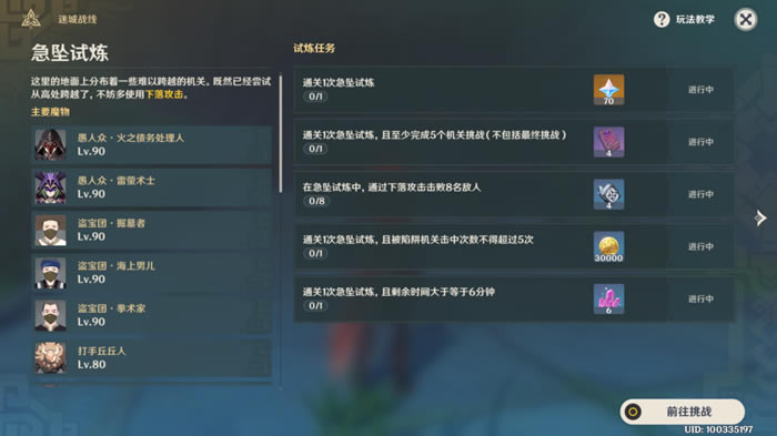 愈疗试炼任务: ◆任务1:通关一次急坠试炼 ◆任务2:通关一次急坠试炼,且至少完成5个机关挑战(不包括最终挑战) ◆任务3:在急坠试炼中,通过下落攻击击败八名敌人