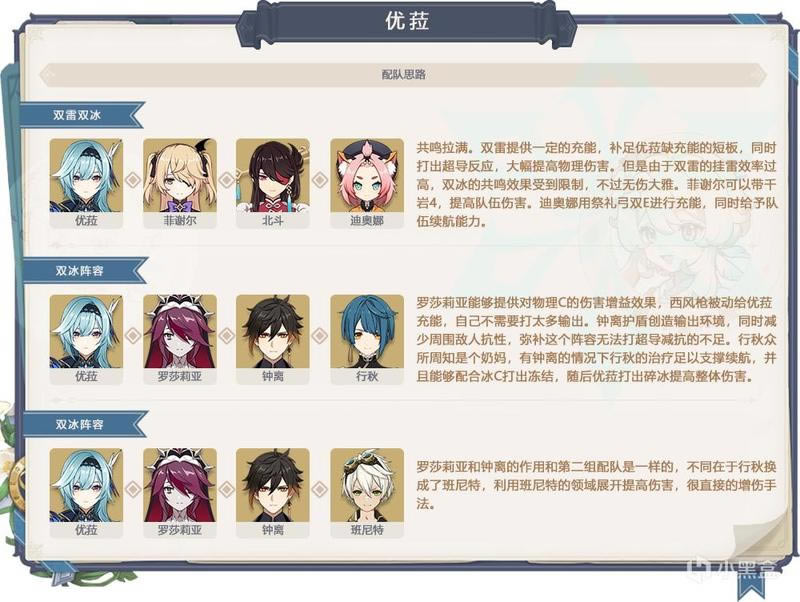 角色介绍: 主C定位 双手剑武器 90突破+38.4%暴伤 【普通攻击·西风剑术·宗室】:输出的重要组成部分,占比较高,优先点满。 【元素战技·冰潮的涡旋】:机制比较复杂,简单来讲就是短按可以强化长按那一下的效果,主要是一轮普攻后E正好CD完毕,可以取消普攻后摇,手感比较丝滑。而且可以被用来触发超导,辅助性质的技能,最后点满。 【元素爆发·凝浪之光剑】:强调最后光降之剑的物伤爆发,这个技能应该会创造全服最高白色数字,因为高层数的技能倍率史无前例得高,使得这次爆发伤害在整个输出循环中占比也较高,但还是少于普攻的占比,随后点满。 【天赋1 潮卷冰削】:长按E消耗“冷酷之心”将会造成额外伤害,简单直接的增伤天赋,而且会让长按E那一下打出好几个数字,看起来会比较爽 【天赋2 战欲涌现】:Q刷新E的CD,鼓励你先长按E后再接Q+短按E 【天赋3 贵族的自省】:天赋书合成时有概率获得额外产出。区别于行秋的返还材料,额外产出是同级的,后者返还材料是降低一级的。——谁说只有璃月有读书人? 关键命座: 【1命】光潮的幻象 纯粹的增伤命座,30%物理伤害加成的额度也比较高,性价比很高,有预算的话非常推荐抽取。 【2命】海沫的少女 大幅降低长按E的CD,2命以前是2次短按1次长按,2命后可以选择1次短按1次长按,注意,短按还是要有的,因为优菈的物伤加成更高,还是要触发天赋1的。 【6命】高贵者的义务 变相抬高二段大招的倍率,造就物伤白字核爆第一人。 【Other Tips】 3命对于元素爆发的技能等级提升毕竟是直接的倍率提高,收益还是比较可观的,不要忽视就行。4命的斩杀效果不一定好用,要看实际情况,脆皮小怪不需要这个斩杀直接就秒了,血厚的精英怪可能会有光降之剑触发而怪物血量没有过半,或是过半很多本身就不需要斩杀也能放倒,比较尴尬。 武器推荐: 其实狼末和无工的伤害是比松籁高的,但由于狼末的被动效果不稳定,时常覆盖率偏低;无工之剑需要护盾才能发挥最大实力。相比之下,松籁对于优菈而言没有触发和配队的限制,综合考虑,给出以下推荐优先级 五星:松籁响起之时>狼的末路>无工之剑 四星:黑岩斩刀>螭骨剑>试做古华 圣遗物推荐:
